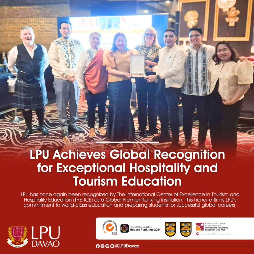 LPU has once again been recognized by The International Center of Excellence in Tourism and Hospitality Education (THE-ICE) as a Global Premier Ranking Institution. This honor affirms LPU’s commitment to world-class education and preparing students for successful global careers.